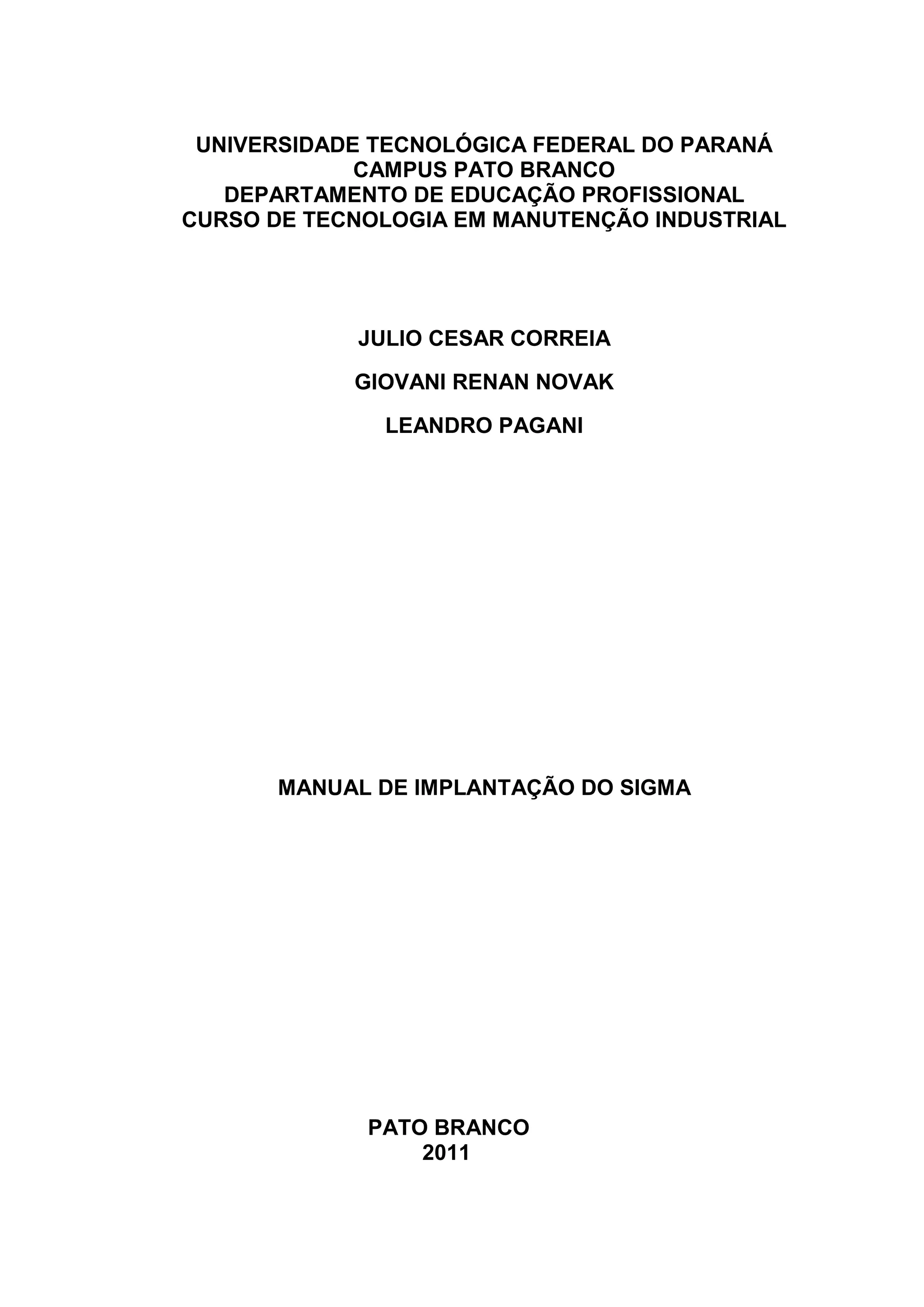 1. O documento apresenta um manual de implantação do sistema SIGMA de gestão da manutenção industrial na Universidade Tecnológica Federal do Paraná campus Pato Branco.