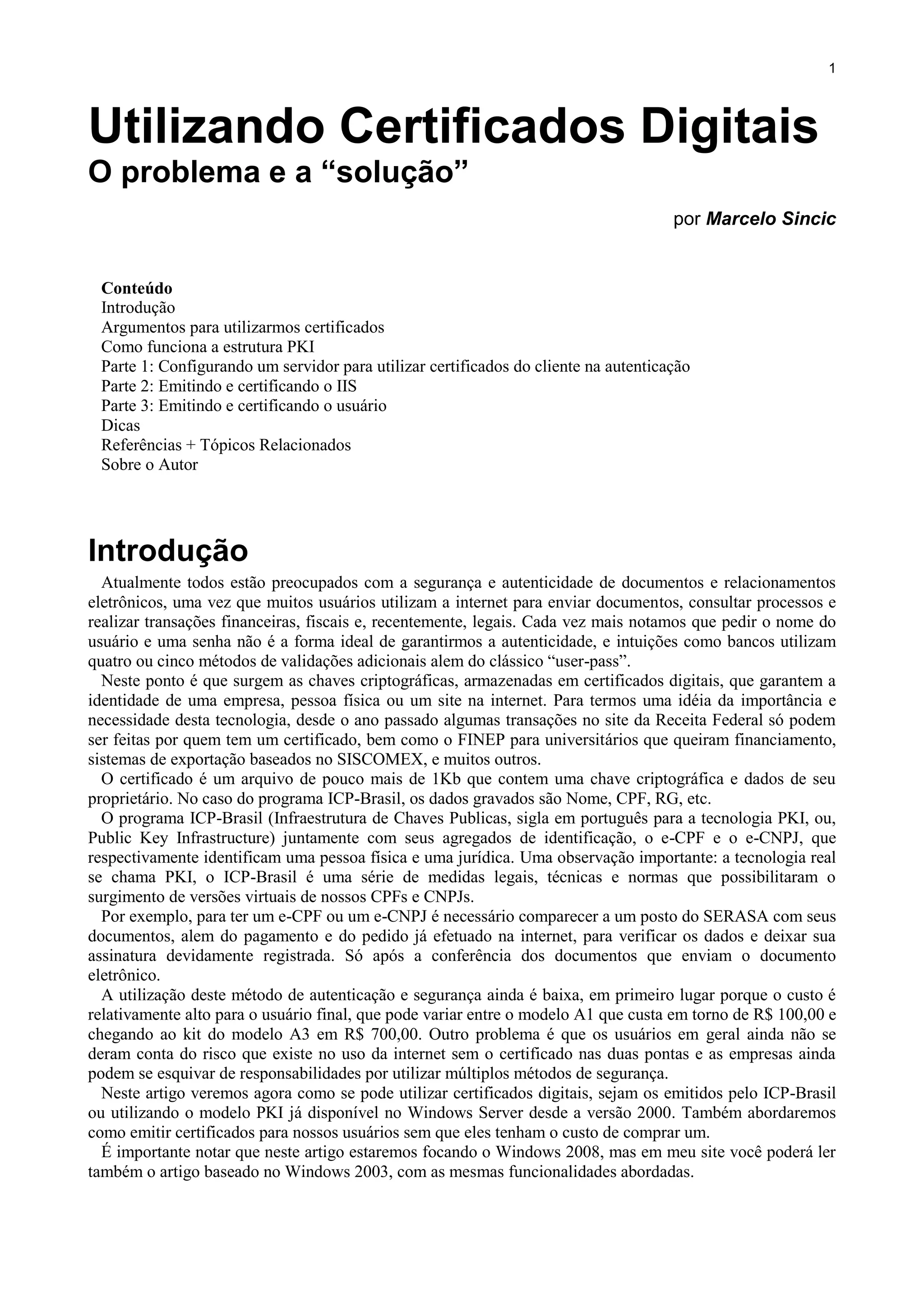 O documento aborda a importância dos certificados digitais e da infraestrutura de chaves públicas (PKI) para garantir a segurança e autenticidade em transações eletrônicas. Ele descreve a configuração de servidores para uso de certificados, comparando modelos como o A1 e A3, além de discutir a emissão de certificados e os custos envolvidos. Também são apresentados argumentos sobre o uso de certificados para autenticação, destacando a necessidade de melhorar a segurança online frente aos riscos existentes.