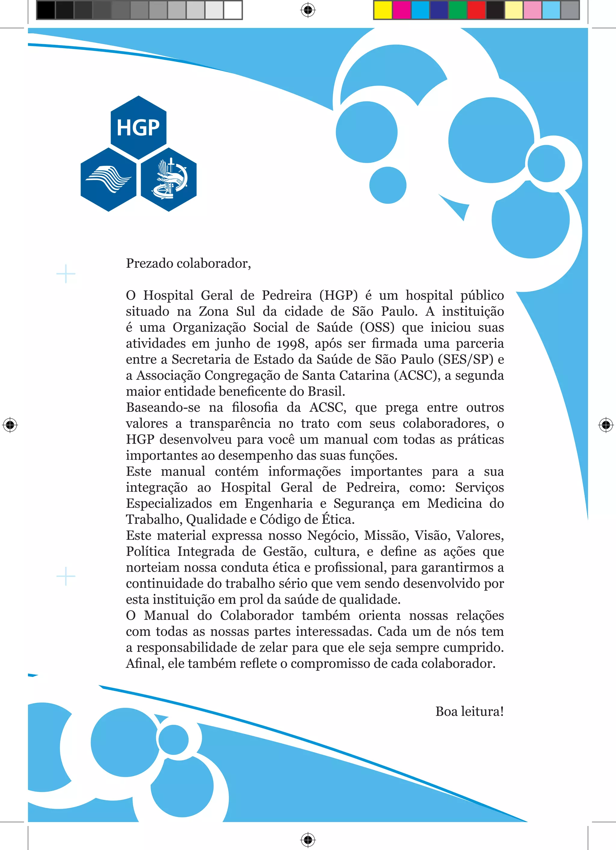 O documento descreve o Hospital Geral de Pedreira (HGP), uma instituição pública de saúde em São Paulo. O HGP fornece um manual para os funcionários com informações sobre serviços, qualidade, ética e conduta profissional para garantir o bom atendimento aos pacientes.