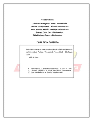 Este documento fornece diretrizes para a apresentação de trabalhos acadêmicos de acordo com as normas da ABNT. Ele descreve os requisitos para o formato, fonte, margens, paginação e estrutura do trabalho, incluindo elementos pré-textuais, textuais e pós-textuais. Além disso, fornece exemplos e instruções detalhadas sobre cada elemento como a capa, folha de rosto, resumos, citações e referências bibliográficas.