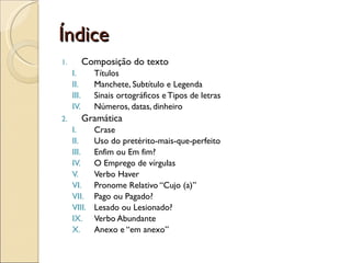 O manual de redação de Ionita Corrêa fornece diretrizes sobre a composição do texto, gramática e uso correto da língua portuguesa, incluindo aspectos como títulos, manchetes, sinais ortográficos, números e datas. Apresenta também orientações sobre o uso da crase, pretérito-mais-que-perfeito, emprego de vírgulas, verbos irregulares, pronomes relativos e verbos abundantes. Ademais, discute a diferença entre 'anexo' e 'em anexo', enfatizando a importância da norma culta na redação.