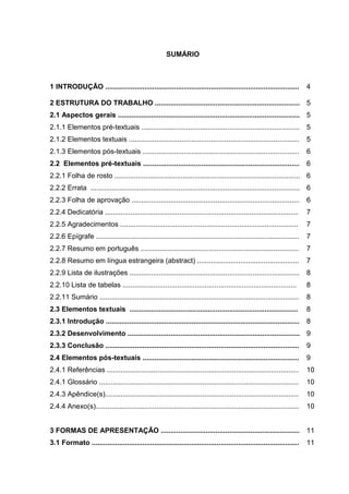 Este documento fornece orientações sobre a estrutura e formatação de trabalhos científicos de acordo com as normas da ABNT. Ele explica os elementos pré-textuais, textuais e pós-textuais que compõem um trabalho e fornece detalhes sobre cada seção. Além disso, fornece instruções sobre formatação, margens, espaçamento e citações.