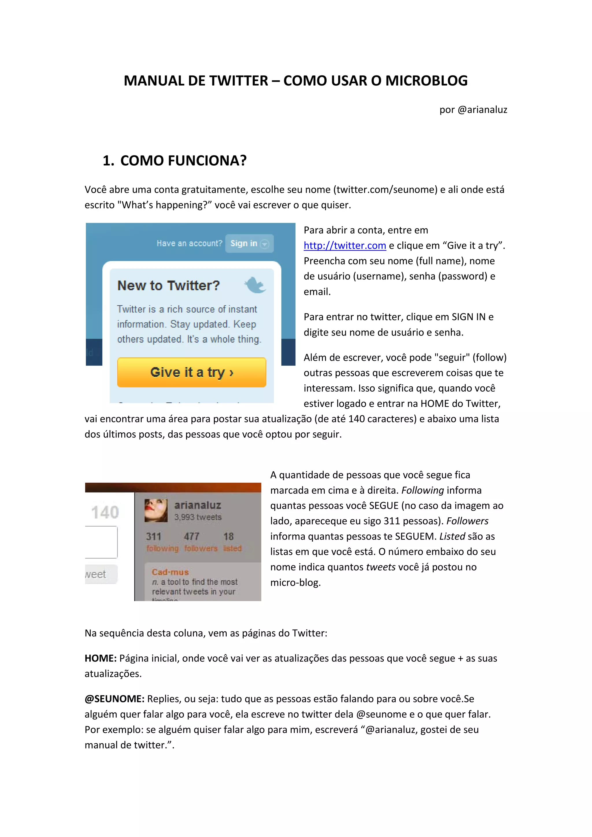 O documento fornece instruções sobre como usar o Twitter, incluindo: (1) como criar uma conta e seguir outras pessoas, (2) como postar links, fotos e vídeos usando sites de terceiros, e (3) como alterar configurações de perfil, retuitar, bloquear outros usuários e twittar de qualquer lugar.