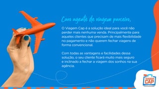 [1] O documento fornece instruções para agentes de viagem venderem o produto "Viagem Cap", que permite clientes pagarem parceladamente por viagens sem juros e concorrerem a prêmios mensais;