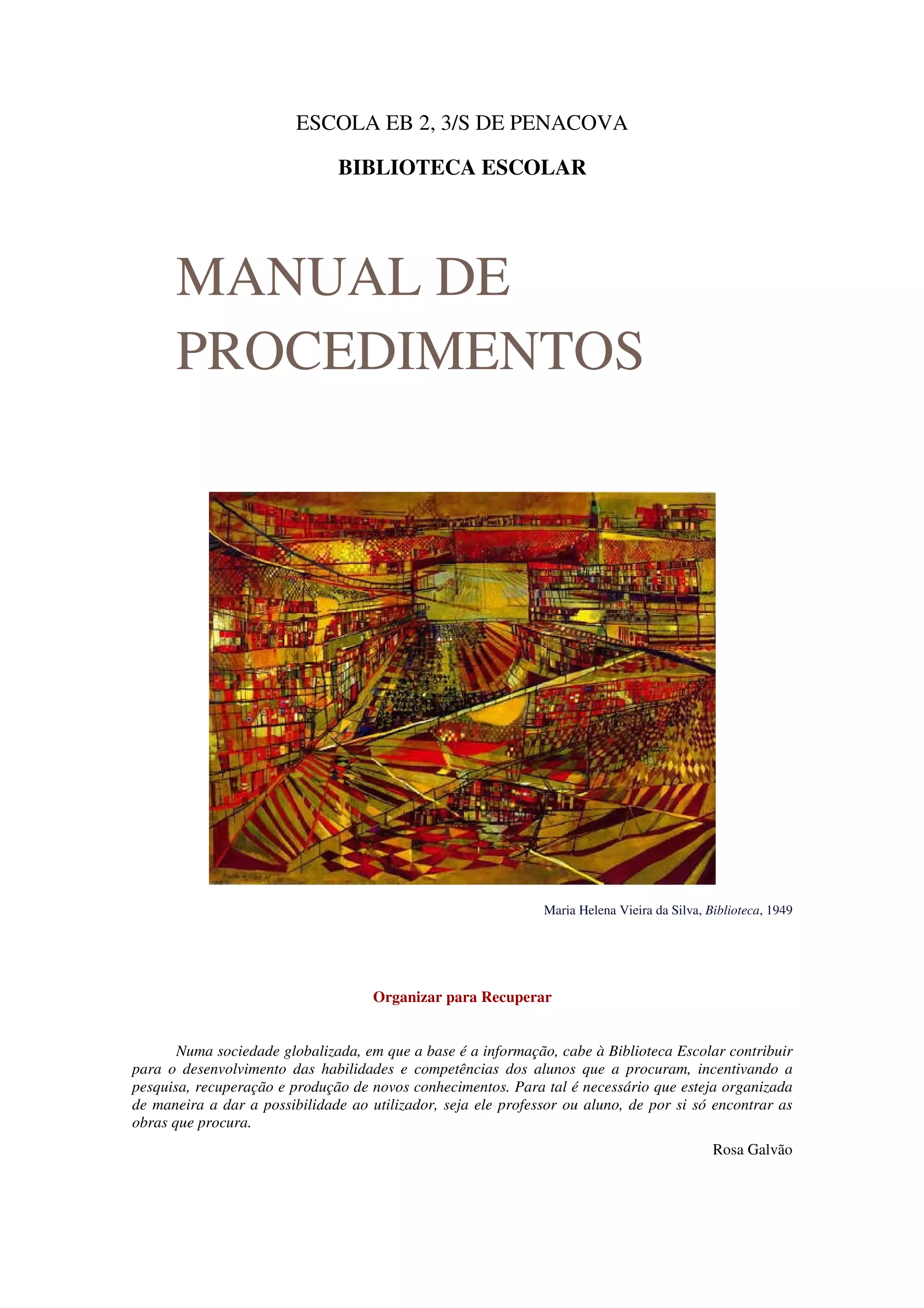1. Este documento apresenta os procedimentos para o tratamento técnico do fundo documental de uma biblioteca escolar, incluindo a seleção, aquisição, registo, carimbagem, catalogação, classificação, indexação, cotação e difusão da informação.