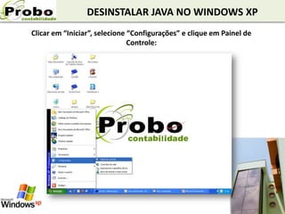 O documento fornece instruções em 6 etapas para desinstalar o Java no Windows XP, incluindo acessar o Painel de Controle, selecionar o Java na lista de programas instalados, confirmar a desinstalação e aguardar o processo concluir.