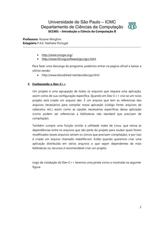 O documento descreve o ambiente de desenvolvimento integrado Dev C++, incluindo suas principais barras de navegação e ferramentas, como a criação e configuração de projetos.