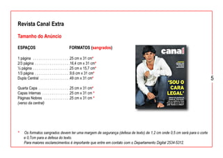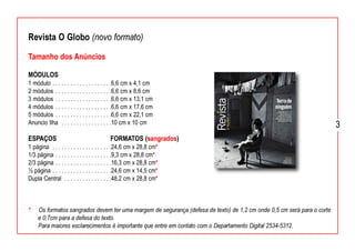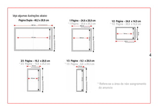 Este documento fornece diretrizes e especificações técnicas para anúncios digitais em várias revistas, incluindo tamanhos de anúncios, formatos, configurações de cores e imagens, tratamento de imagens, envio de arquivos PDF e mais.