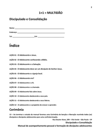 Este manual fornece 12 lições para o discipulado e formação espiritual de adolescentes. O objetivo é preparar os jovens para servir a Deus, integrá-los à igreja local e ensiná-los a depender da Bíblia. A lição 1 discute a importância de Jesus amar os jovens e querer que eles estejam em sua presença, usando exemplos bíblicos como Samuel e a necessidade de ouvir e obedecer ao chamado de Deus.
