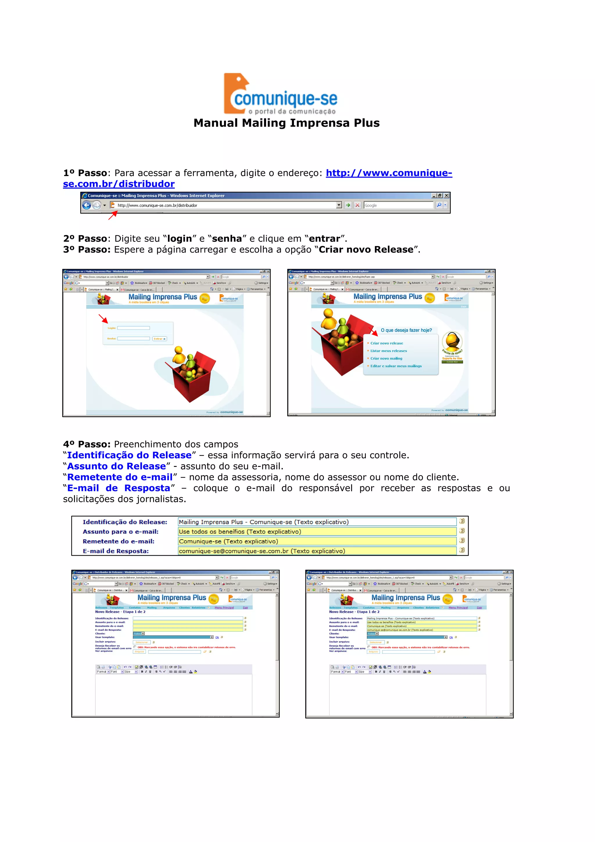 Este documento fornece instruções passo-a-passo sobre como usar a ferramenta de distribuição de imprensa online para criar e enviar releases de imprensa, incluindo como inserir texto, imagens e hiperlinks. Os usuários precisam acessar o site, fazer login, criar um novo release, preencher os campos de identificação e assunto, escolher um modelo, copiar e colar o texto no editor, anexar imagens e adicionar hiperlinks às imagens.