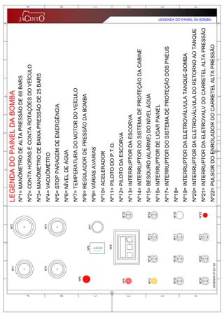 Este manual fornece instruções sobre a operação e manutenção de um veículo bombeiro florestal. Detalha os componentes elétricos e painel de controle, explica como operar a bomba de água, regulador de pressão e outros equipamentos. Inclui também seções sobre manutenção dos componentes e esquemas elétricos e hidráulicos.