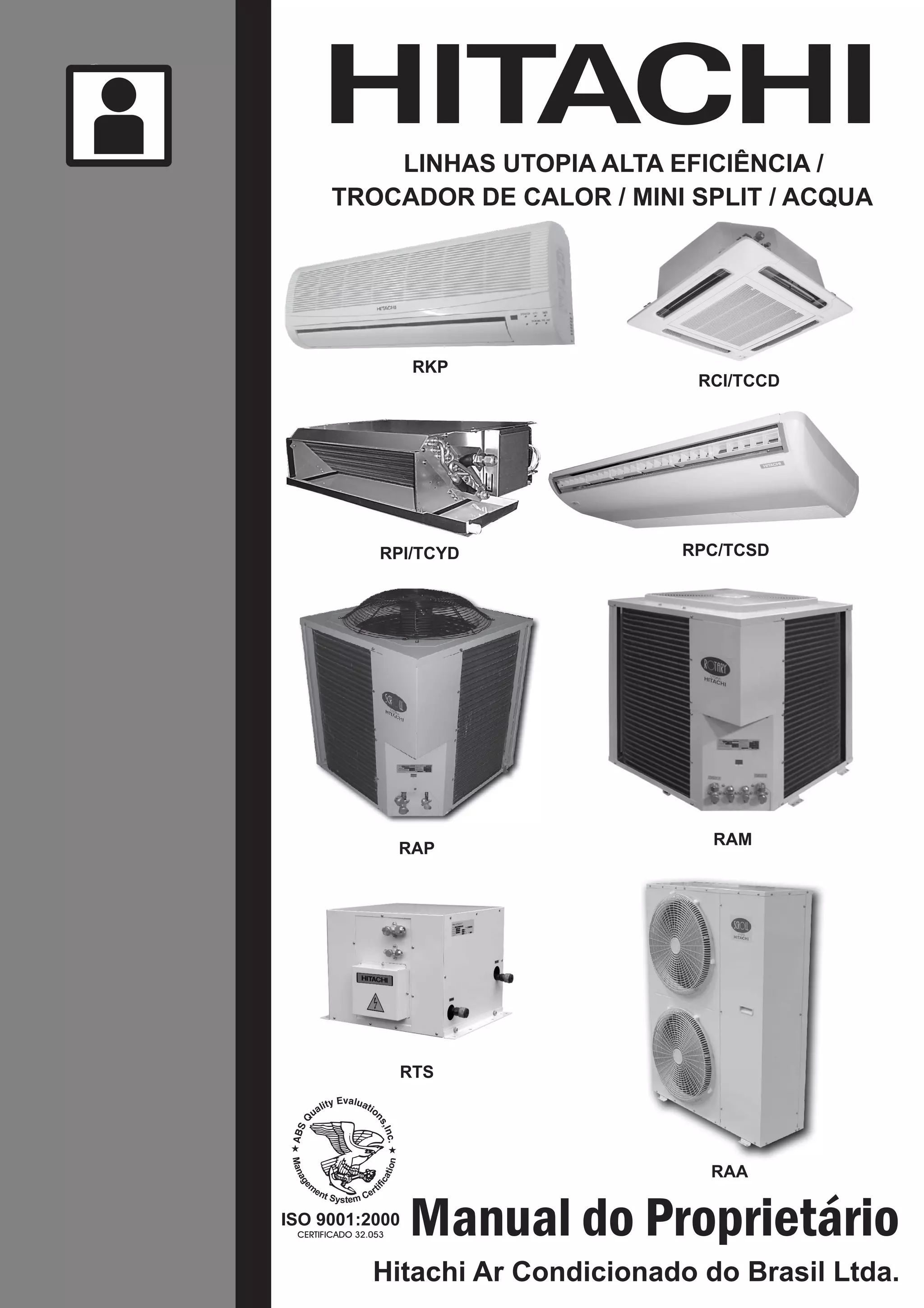 1) O documento fornece instruções sobre a operação e manutenção de condicionadores de ar Hitachi, incluindo linhas Utopia, trocador de calor e mini split.