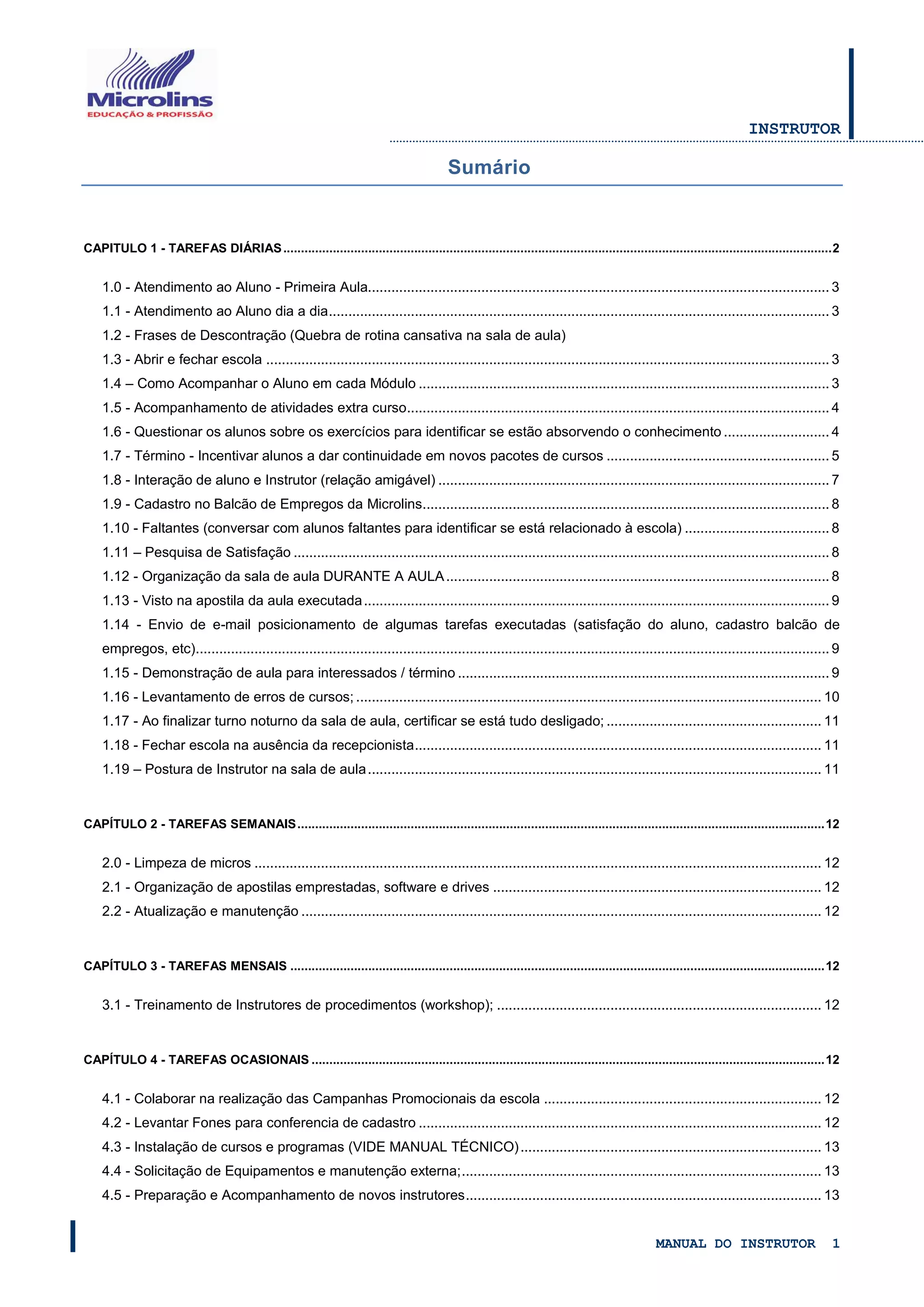 1) O documento fornece instruções para instrutores sobre tarefas diárias, semanais, mensais e ocasionais relacionadas ao trabalho na escola.