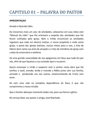 O documento apresenta o manual do líder de uma igreja batista, incluindo a introdução do pastor, o pacto das igrejas batistas, e os valores e propósitos da igreja como a proclamação do evangelho, edificação, serviço e adoração.