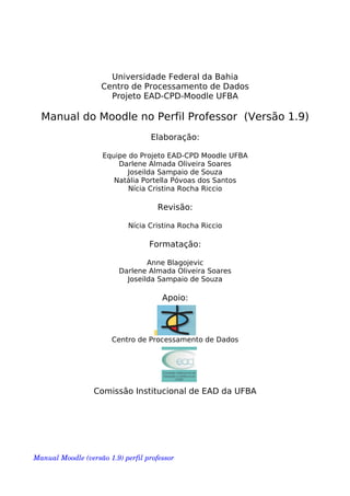Este documento fornece um manual sobre como usar o Moodle no perfil de professor. Ele explica como acessar e usar as ferramentas do Moodle, como criar e gerenciar conteúdo, trabalhar com atividades e recursos, e configurar preferências e grupos.