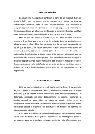 Este documento fornece orientações para a elaboração do Trabalho de Conclusão de Curso (TCC) no curso de Jornalismo. Ele explica o que é uma monografia, as etapas do desenvolvimento do TCC, incluindo a elaboração do projeto de pesquisa e esboço dos capítulos. Também fornece informações sobre a avaliação e cronograma para a conclusão do trabalho.