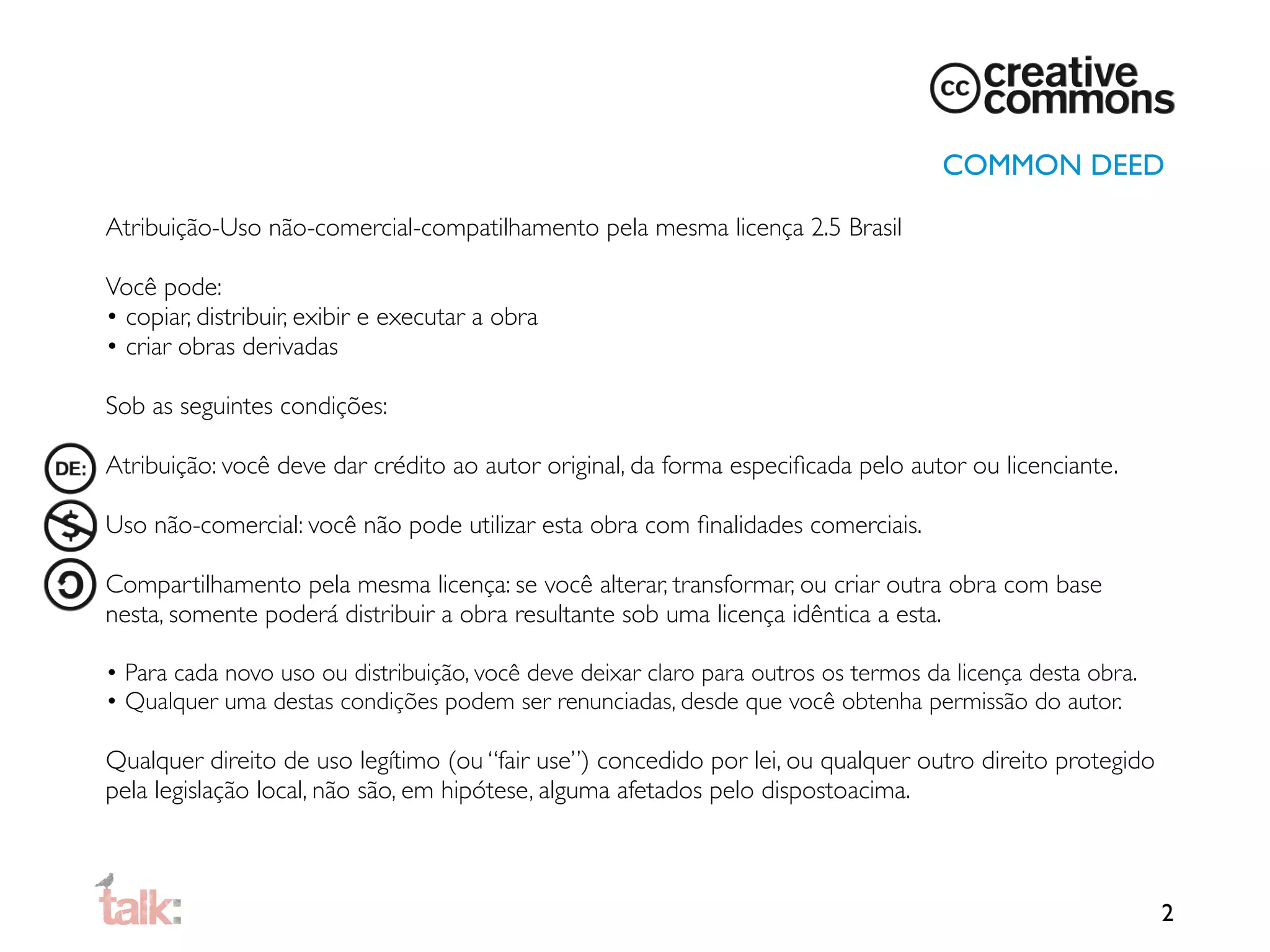 Este documento apresenta os termos de uma licença Creative Commons que permite a cópia, distribuição, exibição e criação de obras derivadas de uma obra original, desde que atribuída a autoria original, sem uso comercial e sob a mesma licença para as obras derivadas. A licença também deixa claro que os direitos de uso justo e proteções legais não são afetados.