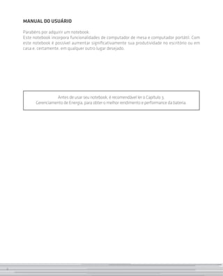 O manual do usuário fornece instruções sobre como configurar e usar com segurança o notebook, explicando seus principais componentes, funções e recursos. Ele instrui o usuário a ler o capítulo sobre gerenciamento de energia para obter o melhor desempenho da bateria, e descreve que o notebook oferece funcionalidades de desktop e laptop, permitindo maior produtividade no escritório, em casa ou em qualquer lugar.