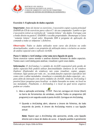 Este documento discute a exploração de dados espaciais em SIG usando o ArcCatalog. Inclui instruções sobre como visualizar shapefiles, coverages, raster e outros formatos de dados espaciais e examinar suas propriedades e atributos. Também fornece um exercício passo a passo para explorar dados espaciais em formatos diferentes.
