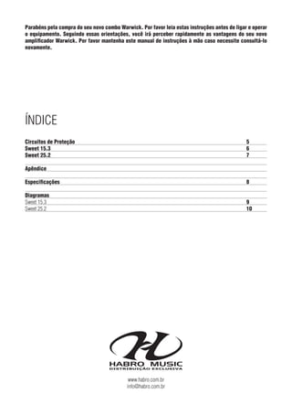 Este manual fornece instruções sobre o uso seguro e correto de dois modelos de amplificadores para baixo da marca Warwick: o Sweet 15.3 e o Sweet 25.2. Ele descreve os controles e funções de cada amplificador, especificações técnicas, diagramas e dicas de segurança.