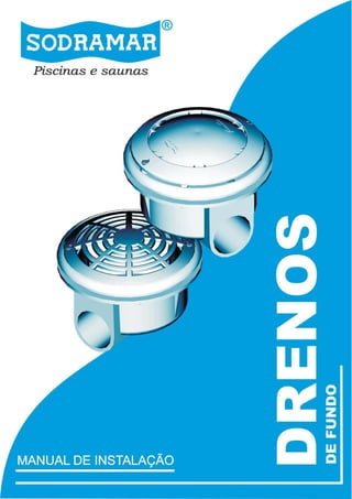 O documento fornece instruções sobre a instalação de drenos de fundo em piscinas, descrevendo os procedimentos para instalação em piscinas de vinil e alvenaria, e conexão direta ou por meio do skimmer. Informa também sobre especificações técnicas, peças, e fornece uma garantia de 12 meses.