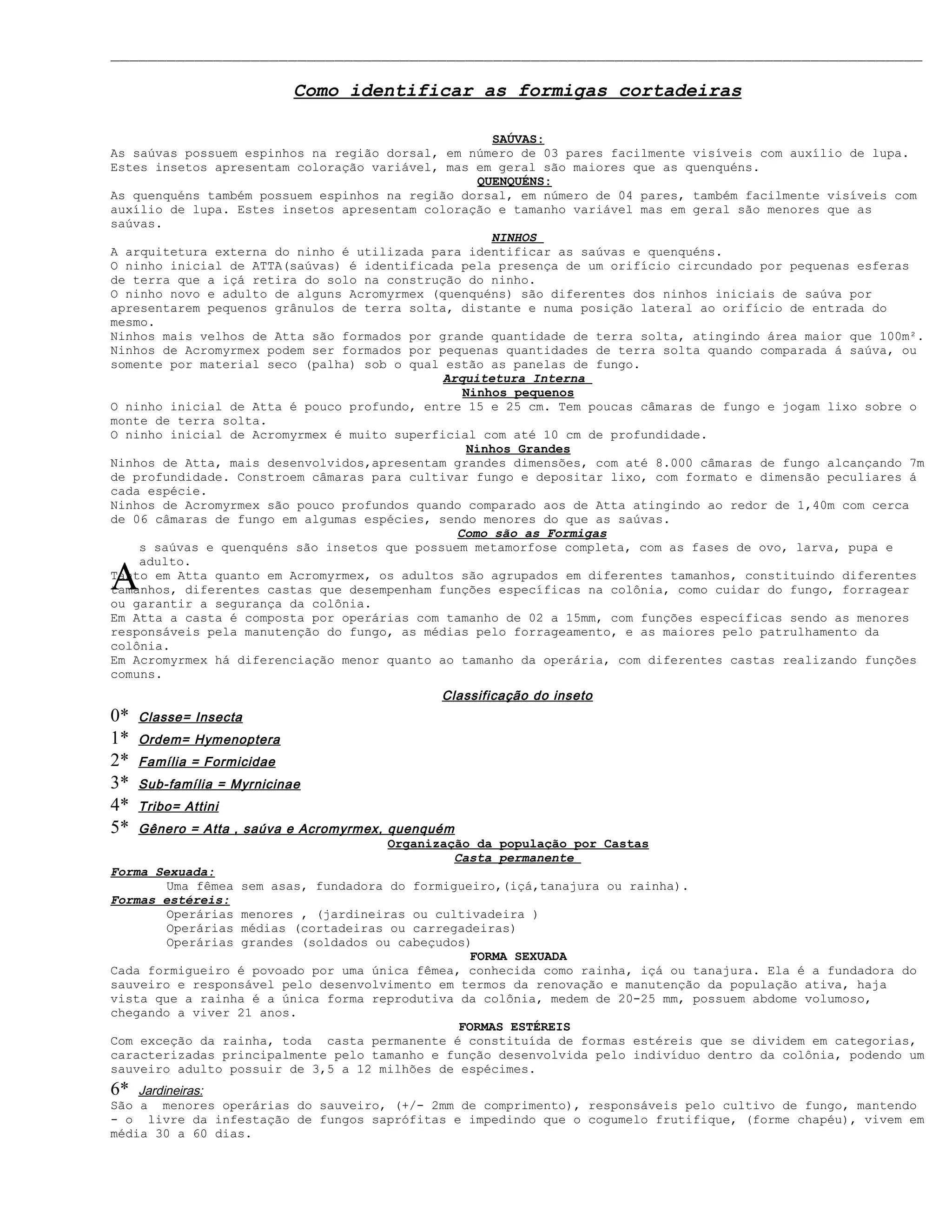 5* Gênero = Atta , saúva e Acromyrmex, quenquém