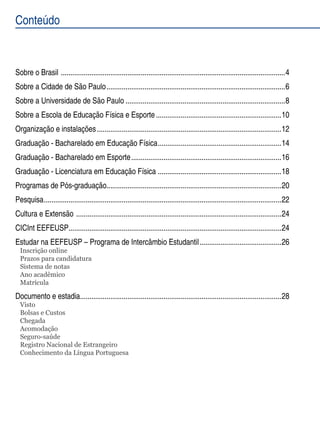 O documento fornece informações sobre a Universidade de São Paulo, uma das mais importantes instituições de ensino superior do Brasil, com 249 cursos de graduação e 239 programas de pós-graduação distribuídos em diferentes campi. A USP tem se destacado em rankings internacionais pela qualidade de seu ensino e pesquisa e vem acelerando o processo de internacionalização de suas atividades.