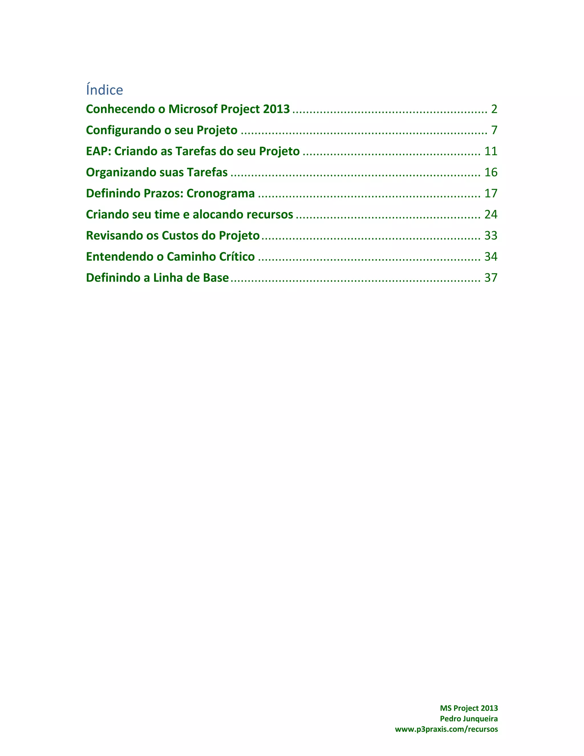 O documento fornece uma introdução ao software Microsoft Project 2013, descrevendo como configurar o projeto, criar tarefas e organizar o cronograma. Explica como definir calendários, configurar informações gerais do projeto e criar a estrutura analítica do projeto (EAP) dividindo tarefas em níveis de resumo e pacotes de trabalho.