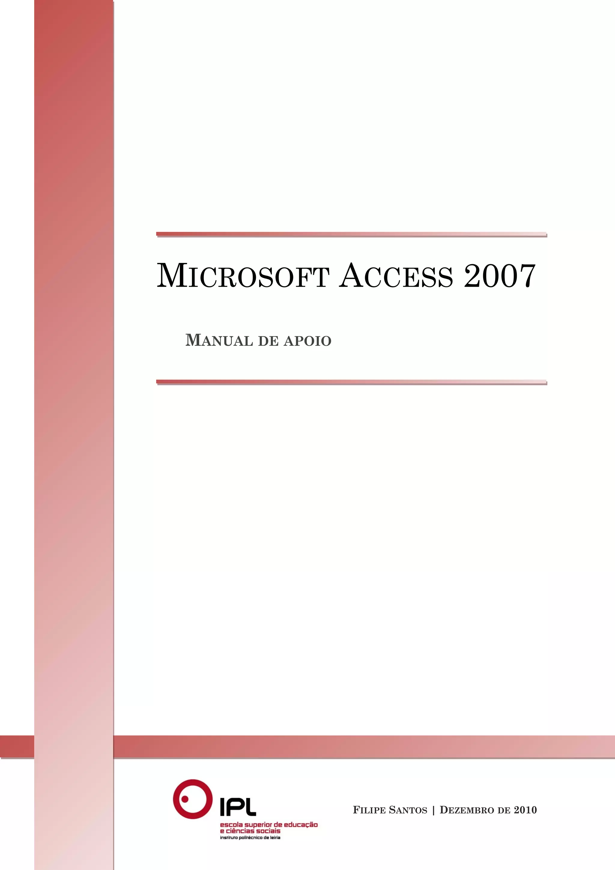 1) Este documento apresenta um manual introdutório ao sistema de gestão de bases de dados Microsoft Access 2007, preparado para alunos do Instituto Politécnico de Leiria. 2) Inclui instruções sobre como criar uma base de dados vazia no Access, estruturar tabelas e campos, definir propriedades e relações entre tabelas, e introduzir registos. 3) Demonstra também como criar consultas para extrair informações armazenadas na base de dados.
