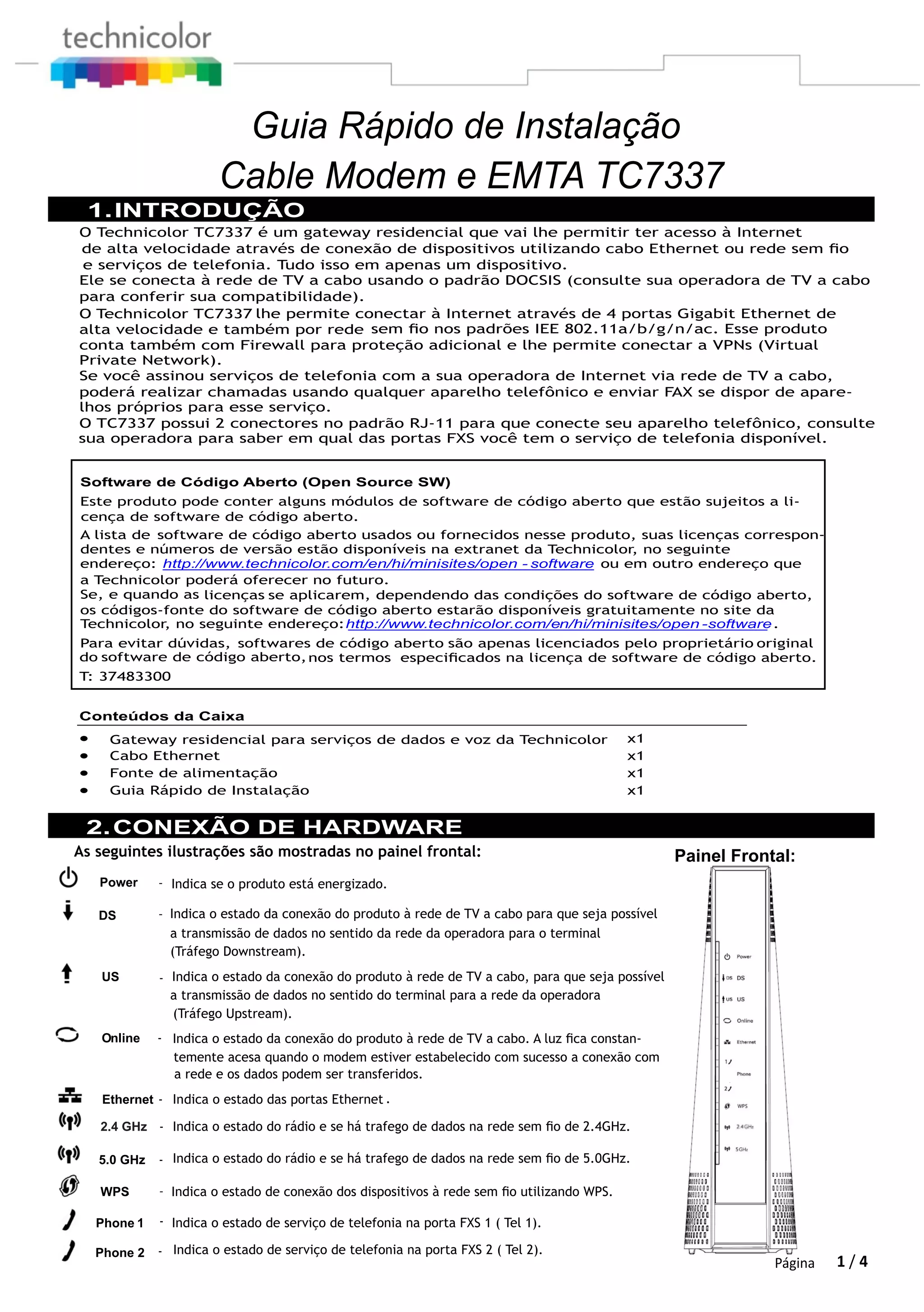 1) O documento fornece instruções sobre como instalar e operar um modem/roteador de cabo, descrevendo suas características e funções.