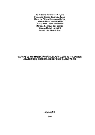 Este documento apresenta as normas para elaboração de trabalhos acadêmicos, dissertações e teses da Universidade Federal de Alfenas-MG (UNIFAL-MG). Ele define os tipos de documentos, estrutura de apresentação, elementos pré-textuais, textuais e pós-textuais, além de orientações sobre apresentação gráfica como formatação, paginação, numeração e uso de tabelas e ilustrações. O manual tem como objetivo padronizar a elaboração desses trabalhos na instituição.