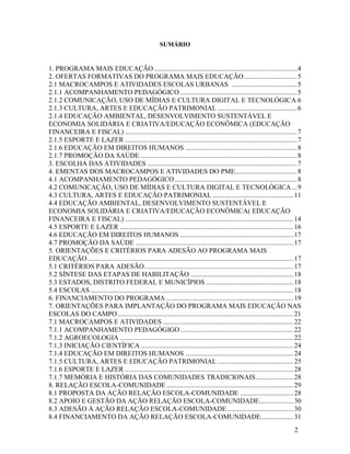 Este documento descreve o Programa Mais Educação, que tem como objetivo ampliar o tempo e o espaço educativo por meio de atividades extracurriculares nas escolas públicas brasileiras. O programa é implementado em sete macrocampos de atividades que abrangem áreas como acompanhamento pedagógico, comunicação, cultura, educação ambiental, esporte, direitos humanos e saúde. As orientações incluem a articulação de políticas públicas, a integração curricular, a capacitação de gestores e a participação da com
