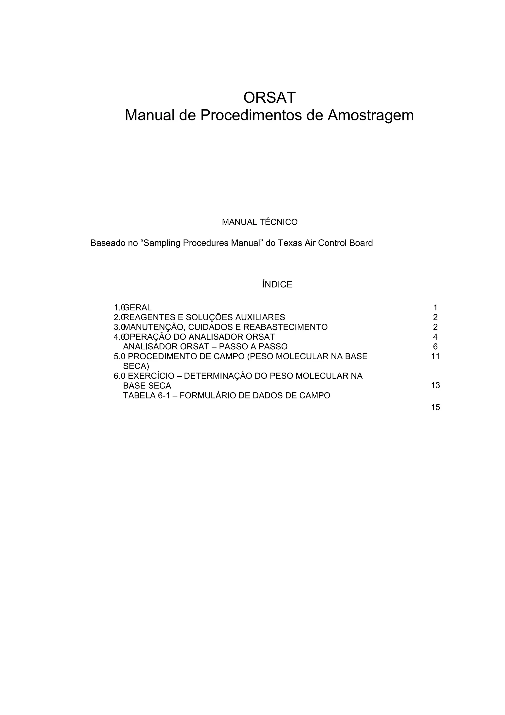 Este documento fornece instruções sobre procedimentos de amostragem de gases usando um analisador Orsat. Descreve os reagentes usados, como manter e operar o equipamento, e os passos para realizar uma análise, incluindo absorção seletiva de CO2, O2 e CO e medição dos volumes para determinar a composição do gás.
