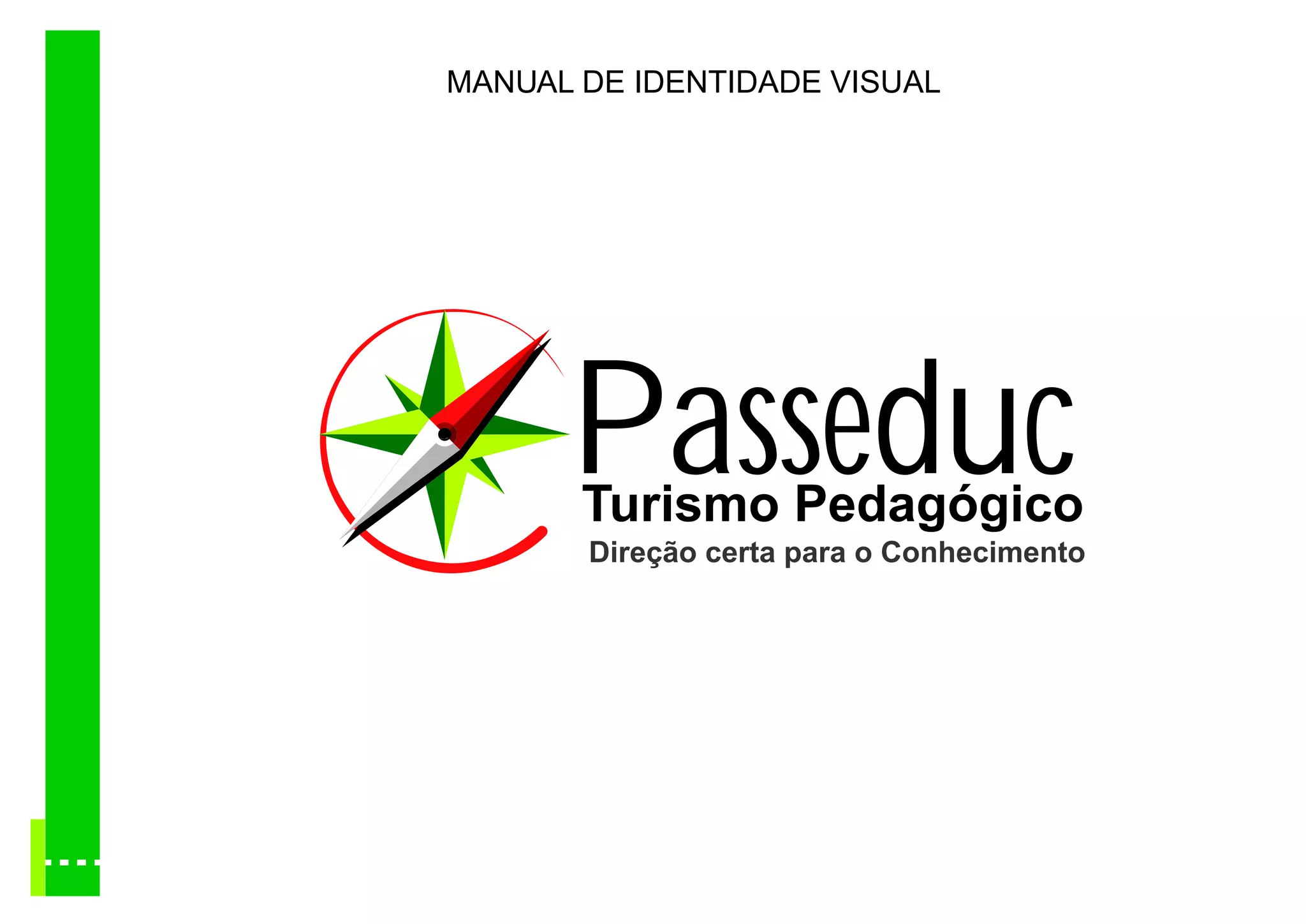O manual apresenta as diretrizes para uso da identidade visual da Passeduc - Turismo Pedagógico, incluindo versões do logotipo, espaçamento, aplicações corretas e incorretas, e orientações finais sobre fidelidade à marca.