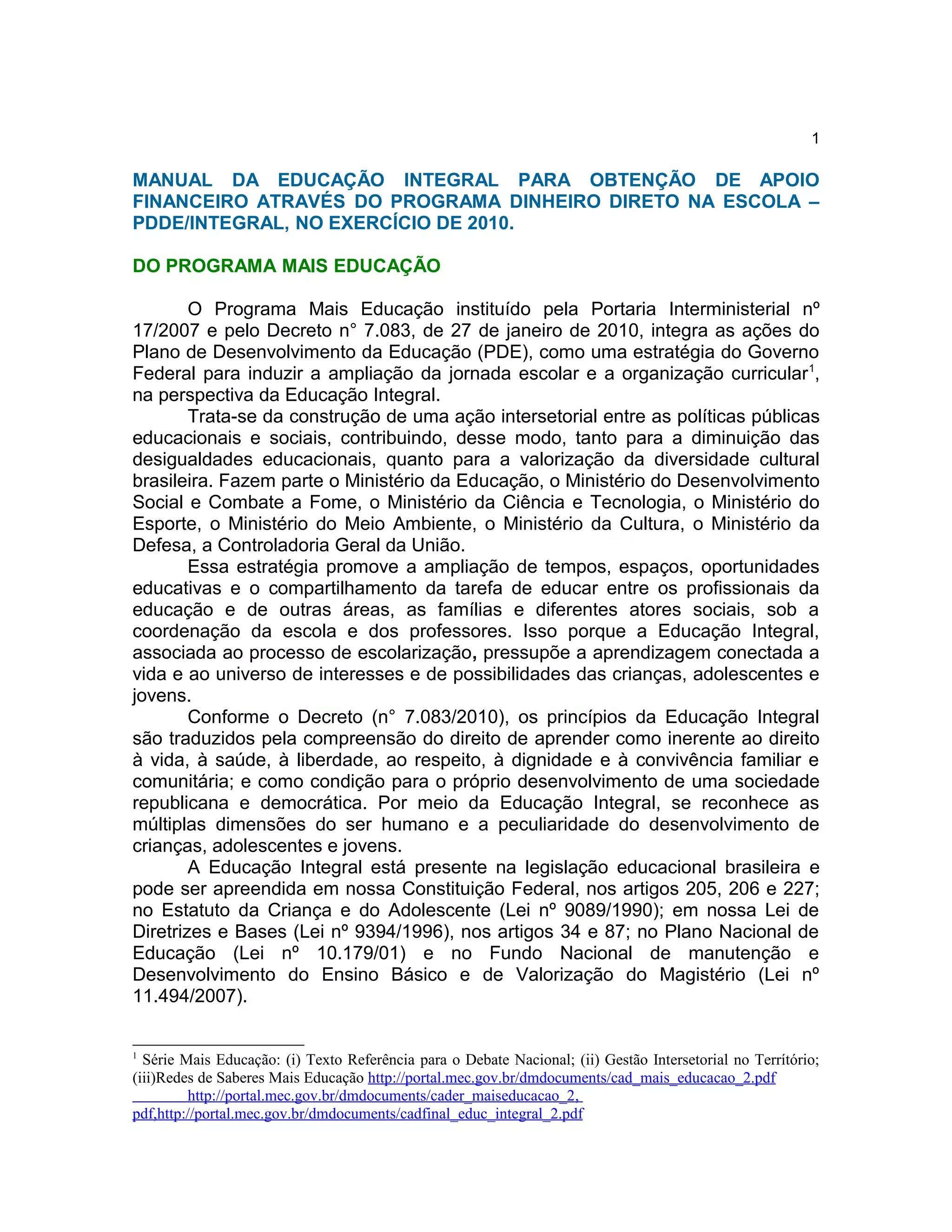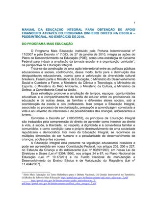 O documento descreve o Programa Mais Educação, um programa do governo federal brasileiro para promover a educação integral nas escolas públicas. O programa oferece apoio financeiro para escolas que expandam seu horário e currículo para incluir atividades como esportes, artes, ciências e tecnologia. O documento lista os critérios para escolas aderirem ao programa e as diferentes atividades formativas que ele apoia.
