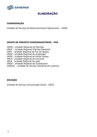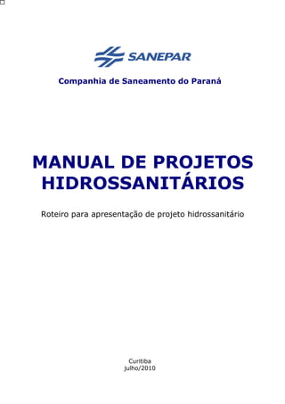 O documento apresenta orientações para a elaboração de projetos hidrossanitários para empreendimentos que necessitem de interligação à rede de abastecimento de água e esgoto da Companhia de Saneamento do Paraná (Sanepar). Inicialmente, descreve as fases de planejamento e projeto, e em seguida detalha os procedimentos e parâmetros técnicos que devem ser observados na elaboração dos projetos hidrossanitários para diferentes tipos de empreendimento.