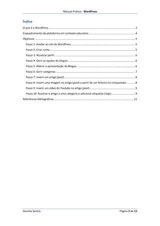 O documento fornece instruções passo-a-passo para criar e gerir um blogue educacional usando a plataforma WordPress. Explica como criar uma conta, personalizar a aparência do blogue, adicionar categorias, criar posts, inserir imagens e vídeos, e associar posts a categorias e tags. O objetivo é mostrar como o WordPress pode ser usado como ferramenta de comunicação entre professores e alunos.