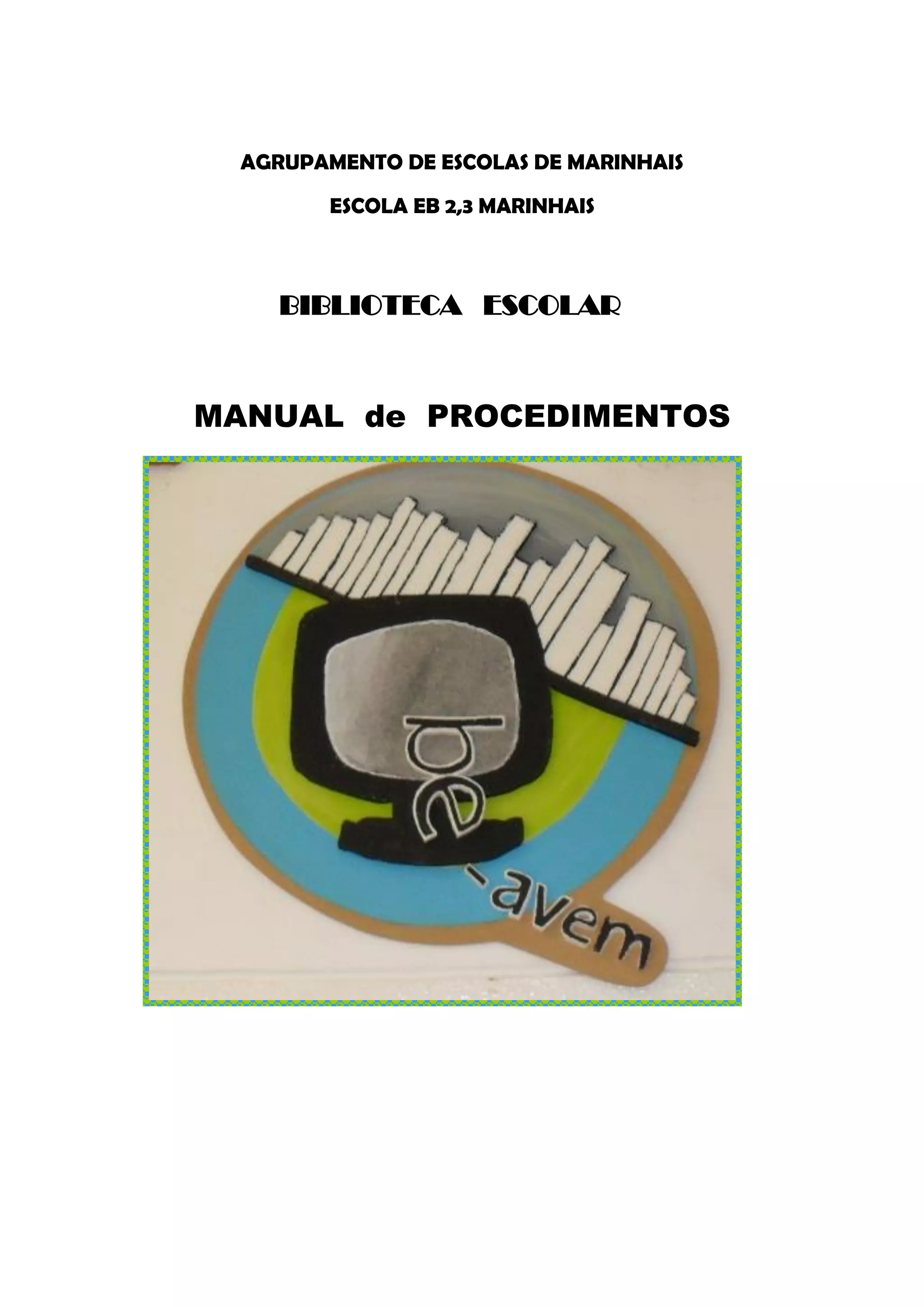 Este manual descreve os procedimentos da biblioteca escolar, incluindo a seleção, aquisição, tratamento técnico, catalogação, classificação, cotação e arrumação dos documentos. Também aborda a organização de dossiês temáticos, a biblioteca itinerante e empréstimos.