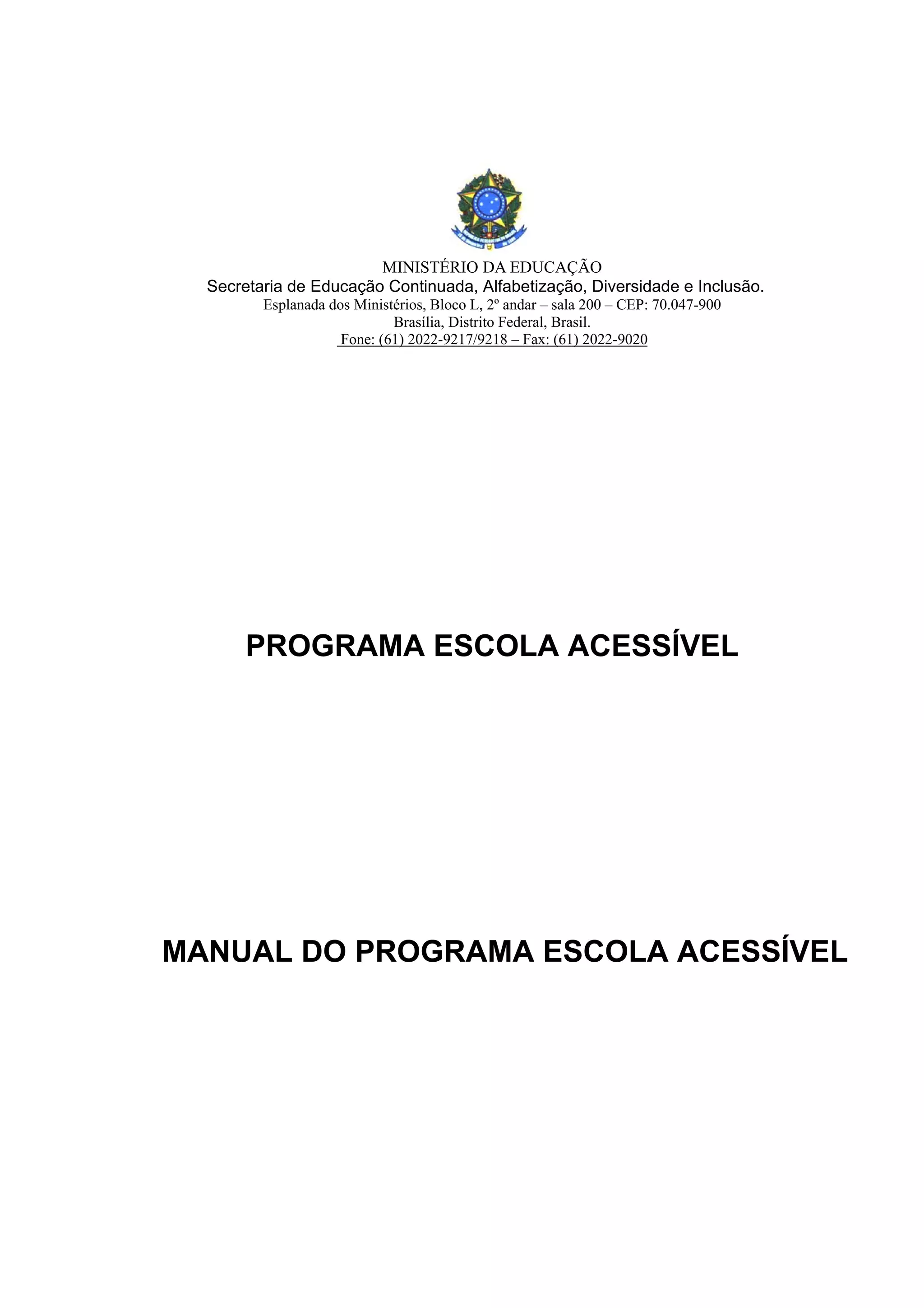 O documento apresenta as diretrizes do Programa Escola Acessível de 2011, que tem como objetivo promover a acessibilidade e inclusão de alunos com deficiência nas escolas públicas. O programa será implementado por meio de parceria entre o MEC, secretarias estaduais de educação e escolas, que deverão elaborar planos de atendimento visando adequar a infraestrutura física e adquirir recursos para promover a acessibilidade.