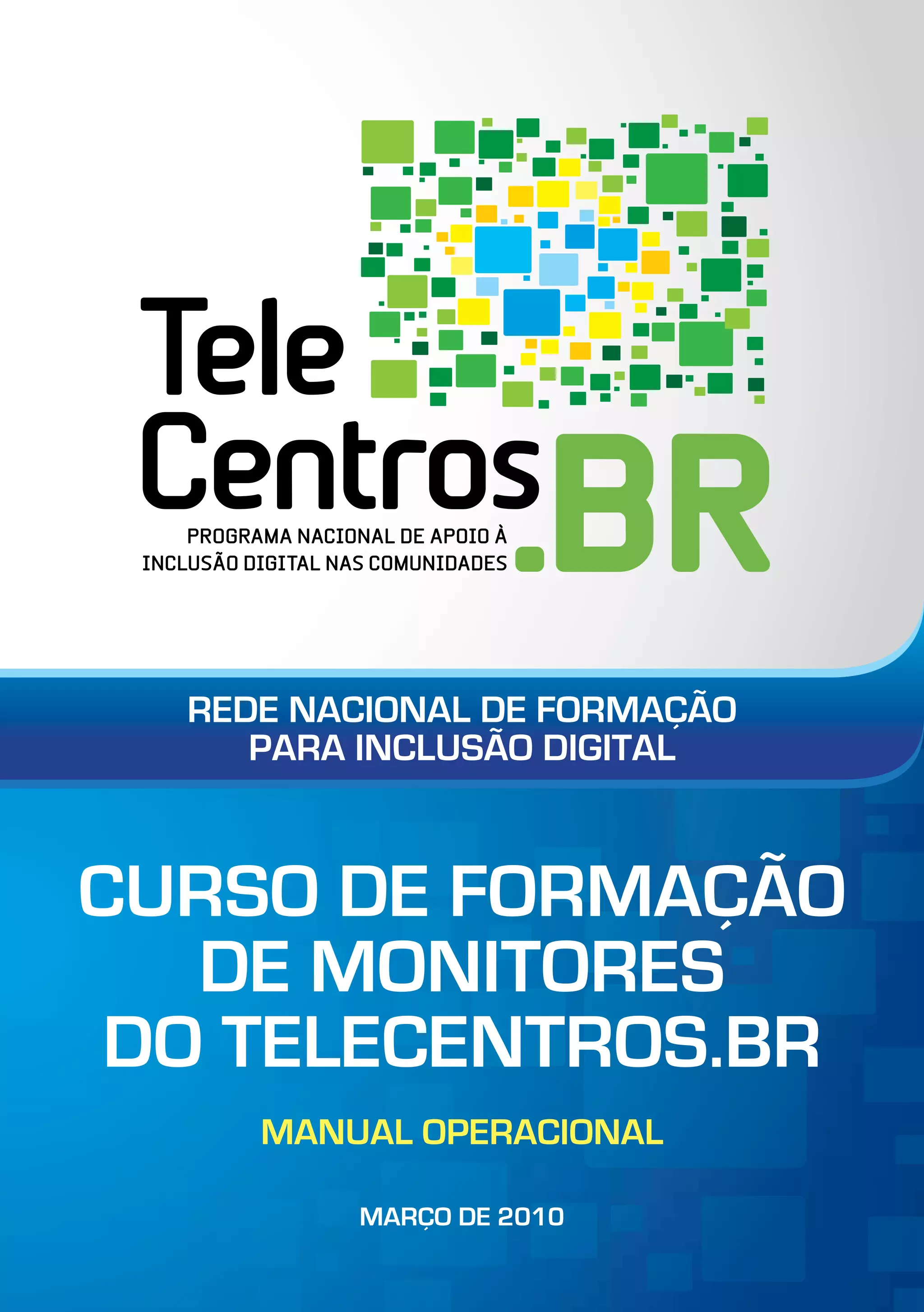 1. O documento descreve o Curso de Formação de Monitores do Telecentros.BR, que visa formar aproximadamente 10 mil monitores de telecentros públicos em todo o Brasil.
