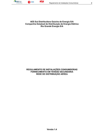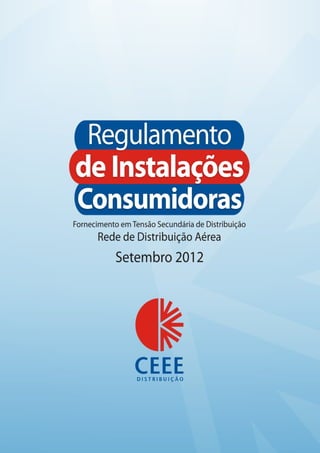 Este documento estabelece as diretrizes e regulamentos para instalações de consumidores de energia elétrica fornecida em tensão secundária pela rede de distribuição aérea. Ele define termos técnicos, especifica condições gerais de fornecimento, critérios para ligações à rede e localização e instalação de medidores. O documento tem como objetivo garantir a segurança e qualidade do fornecimento de energia elétrica aos consumidores.