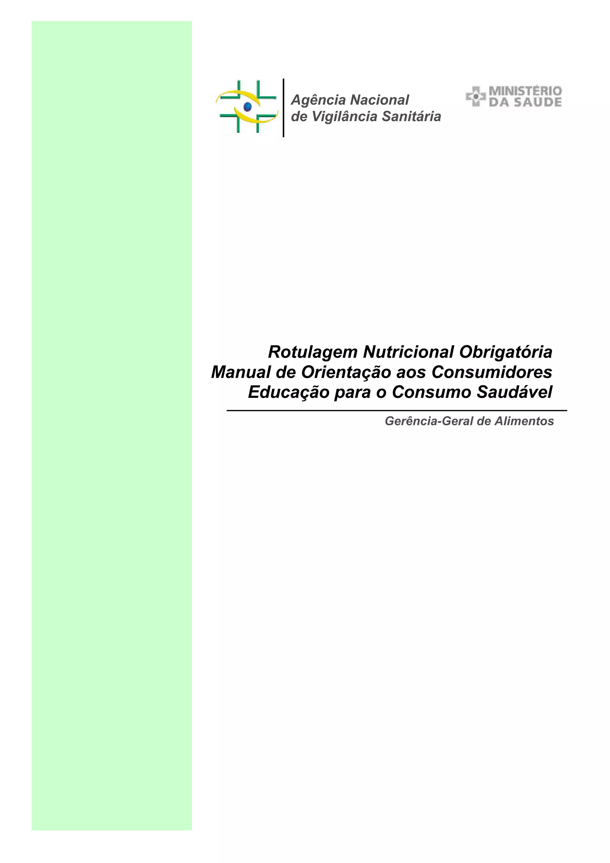 [1] O documento apresenta orientações sobre a rotulagem nutricional obrigatória de alimentos e bebidas embalados no Brasil, com o objetivo de educar os consumidores para escolhas alimentares saudáveis. [2] A Agência Nacional de Vigilância Sanitária (ANVISA) regulamentou a rotulagem nutricional obrigatória em 2001 para que os rótulos informem sobre o valor calórico e teor de nutrientes de cada porção. [3] O manual foi