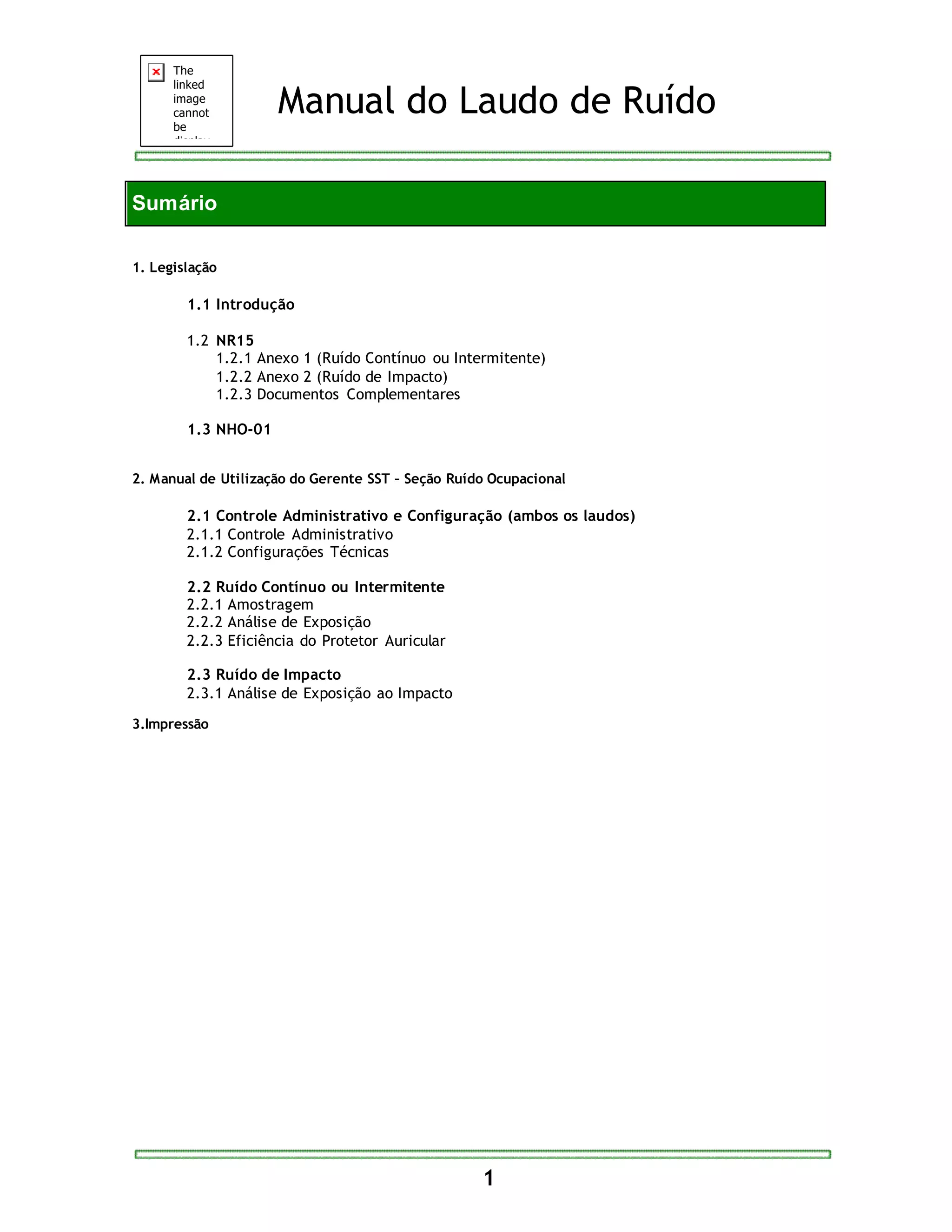 Este documento descreve a legislação brasileira sobre ruído ocupacional, normas técnicas e o manual para realizar laudos de ruído. Apresenta os detalhes da NR-15 que estabelece limites máximos de exposição ao ruído contínuo e impacto. Também explica os procedimentos para aferir e analisar os níveis de ruído no ambiente de trabalho de acordo com os anexos da norma.