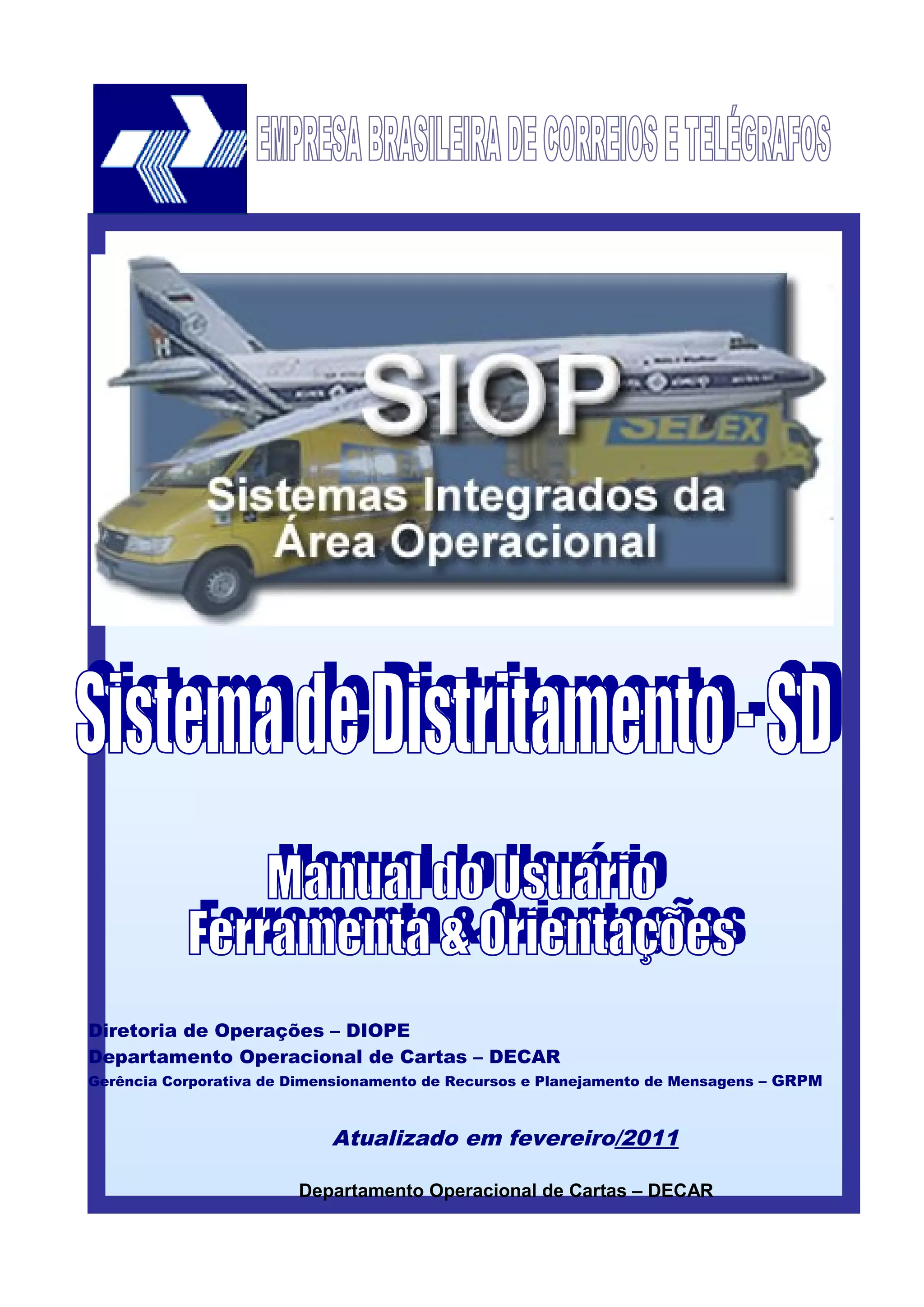 1) O documento apresenta o manual de orientações para uso do Sistema de Distritamento (SD), ferramenta desenvolvida para auxiliar o processo de distritamento em unidades distribuidoras dos Correios.