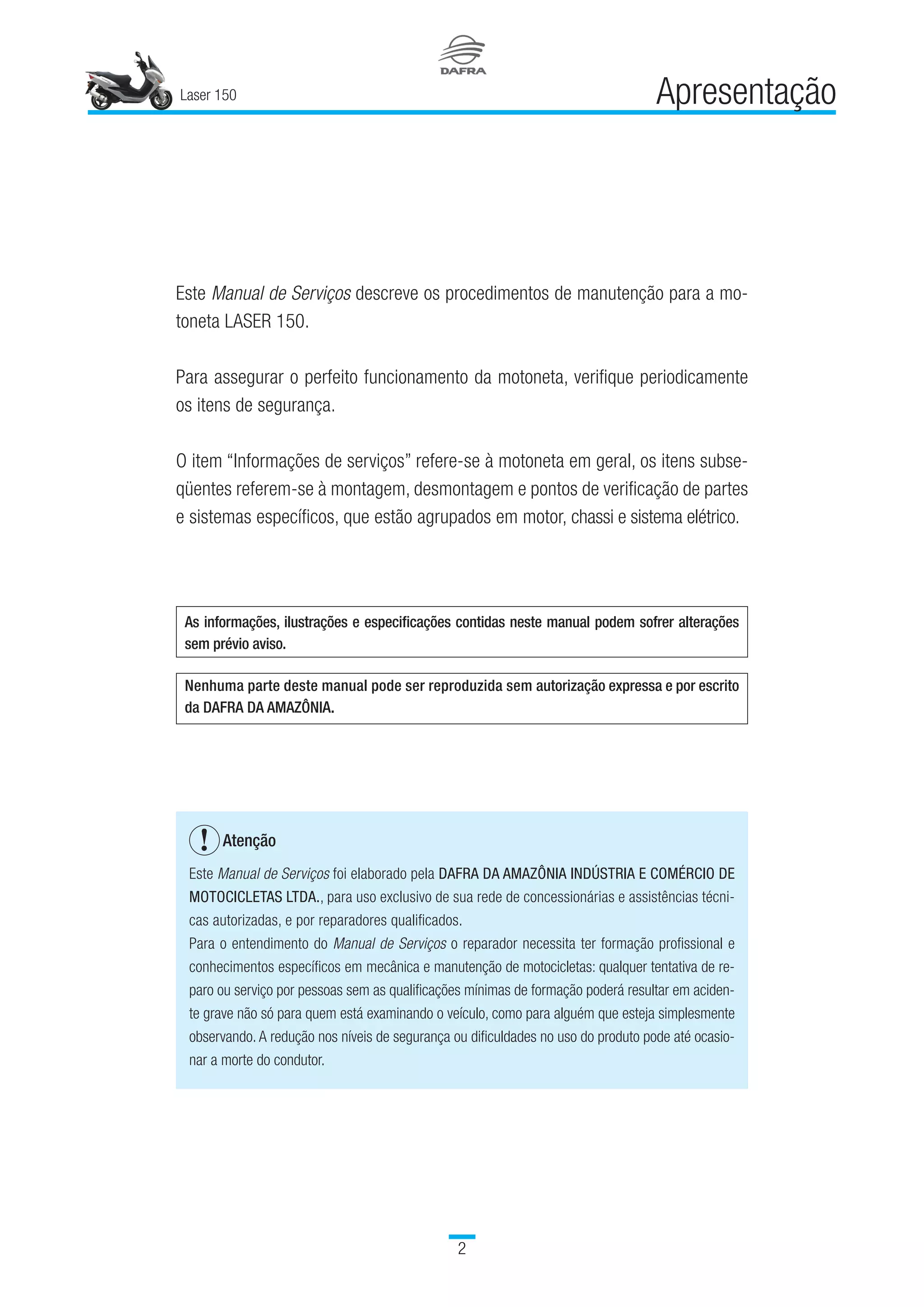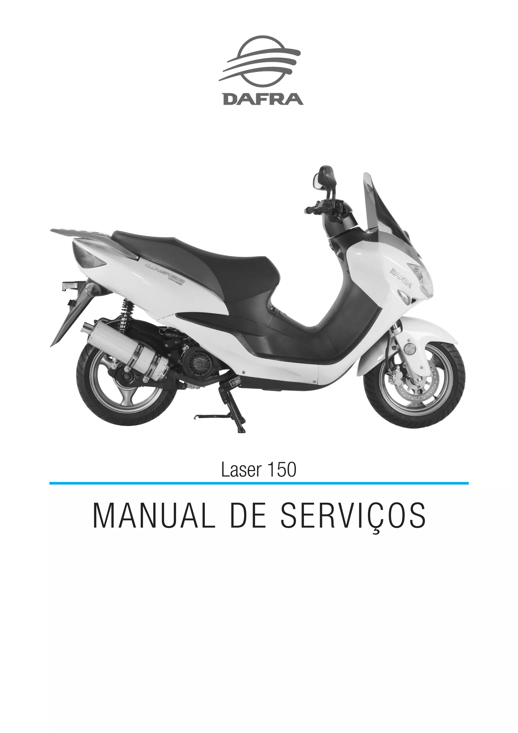 Este manual descreve os procedimentos de manutenção da motoneta Laser 150, cobrindo tópicos como chassi, rodas, freios, suspensão, motor, sistema elétrico e de ignição. Inclui instruções para remoção, inspeção e substituição de peças, além de especificações técnicas e recomendações de segurança.