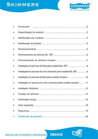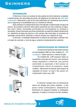 Este documento fornece instruções de instalação e especificações técnicas de três modelos de skimmers para piscinas. Detalha como posicionar e instalar corretamente os skimmers em piscinas de fibra, vinil e alvenaria, além de explicar suas funções e especificações hidráulicas para assegurar uma instalação segura.