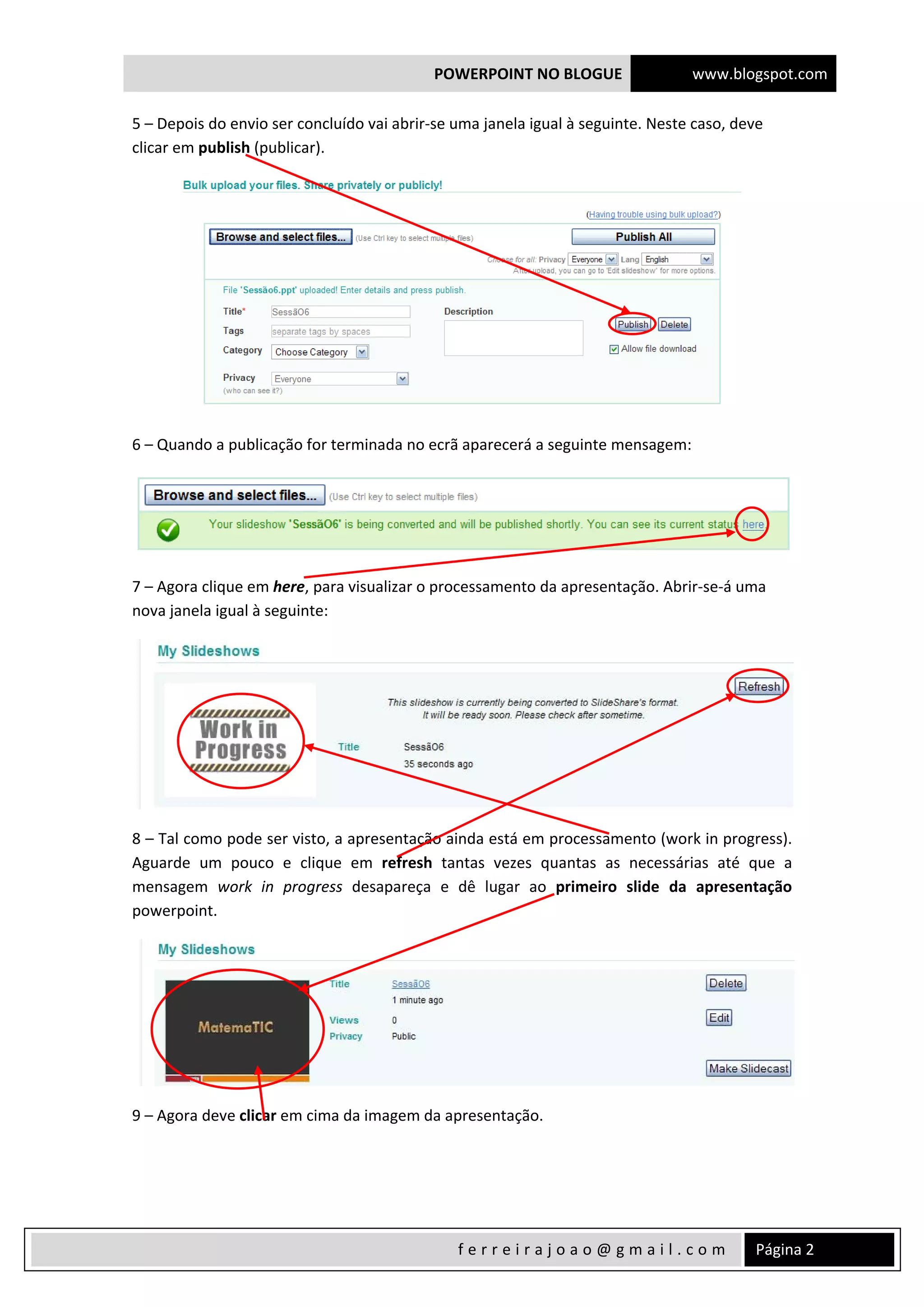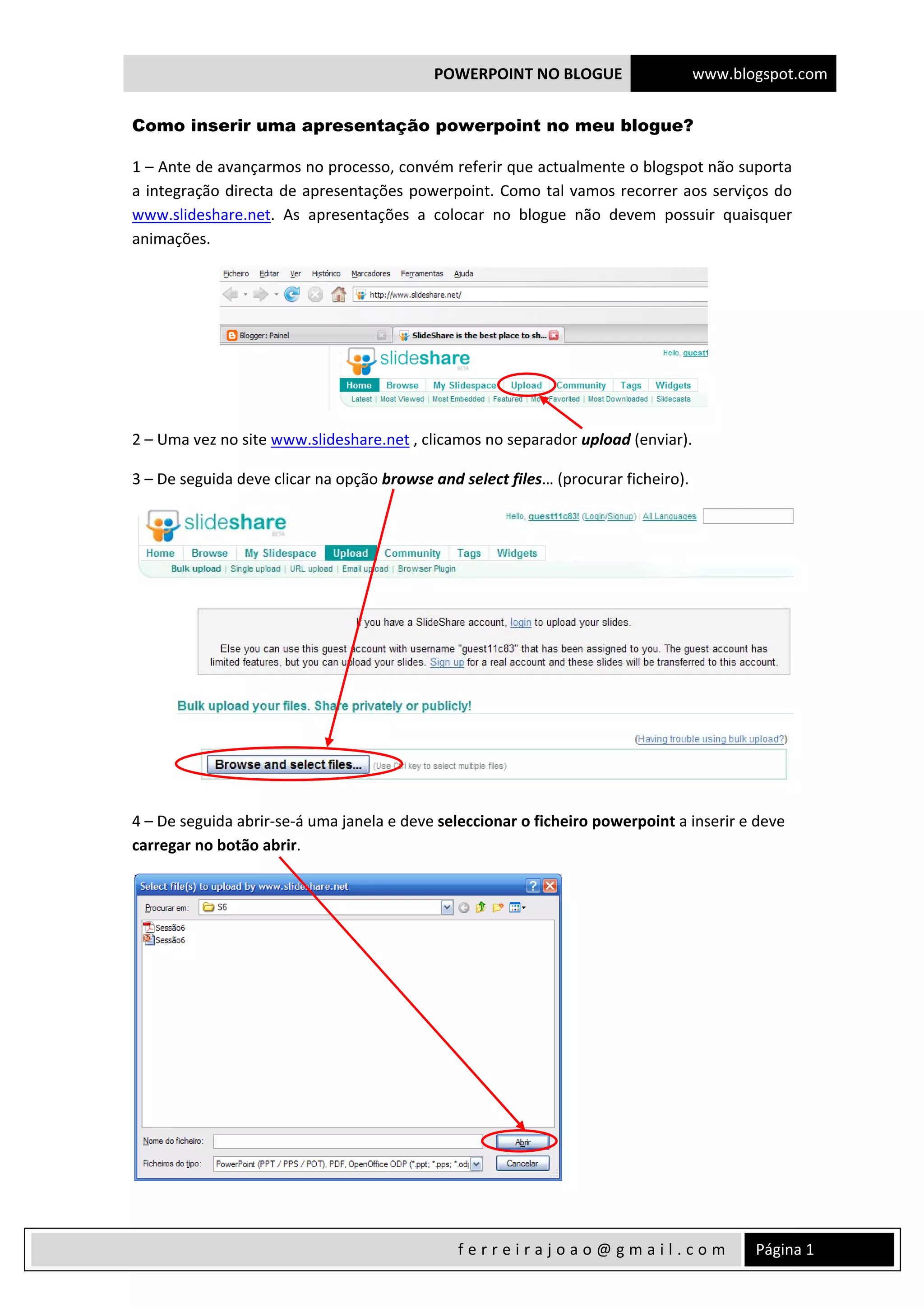 Este documento fornece instruções passo-a-passo para inserir uma apresentação PowerPoint em um blog do Blogger através do serviço SlideShare, começando pela publicação da apresentação no SlideShare e terminando com a postagem no blog.