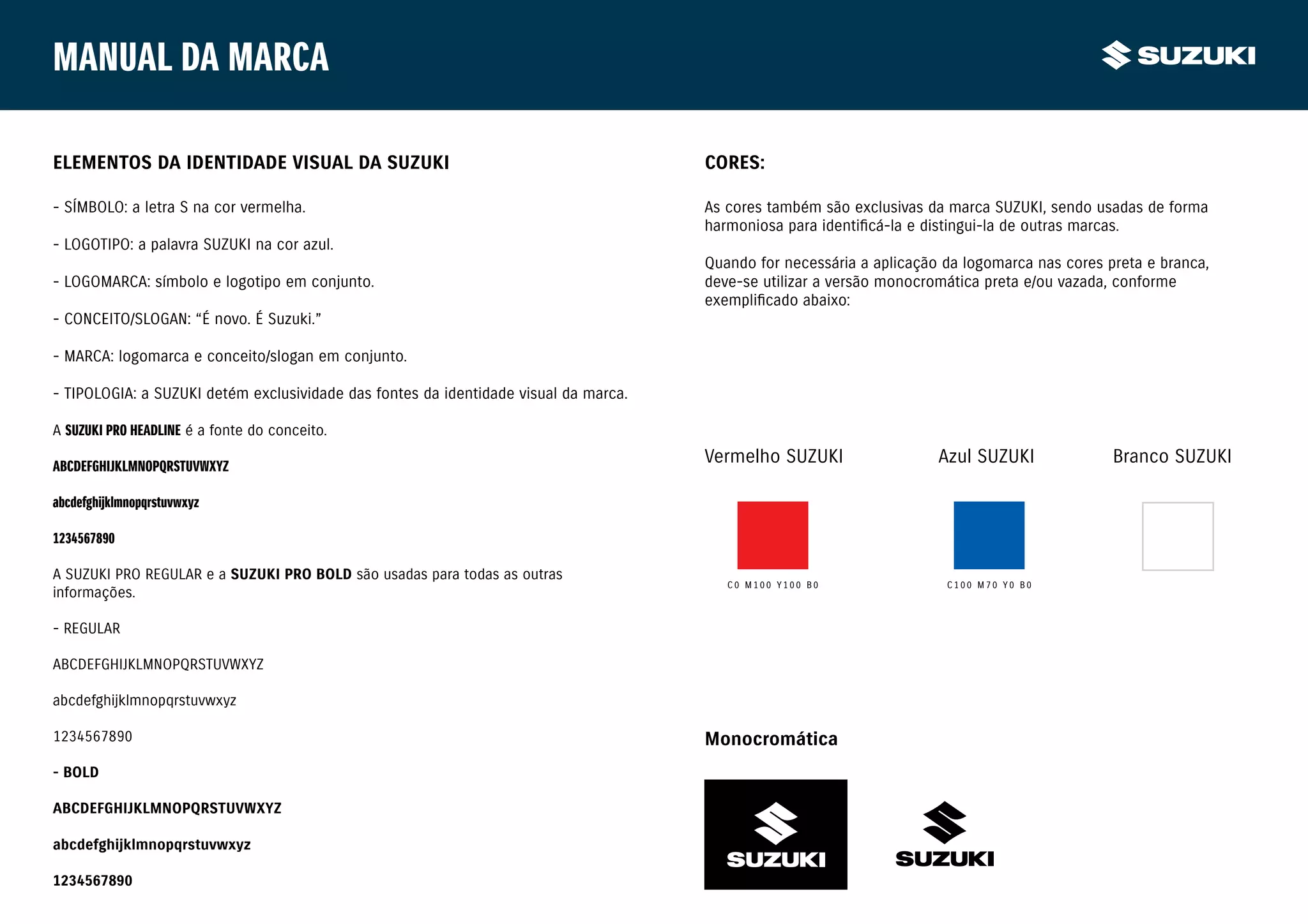 O documento fornece as diretrizes sobre os elementos da identidade visual da marca Suzuki, incluindo: