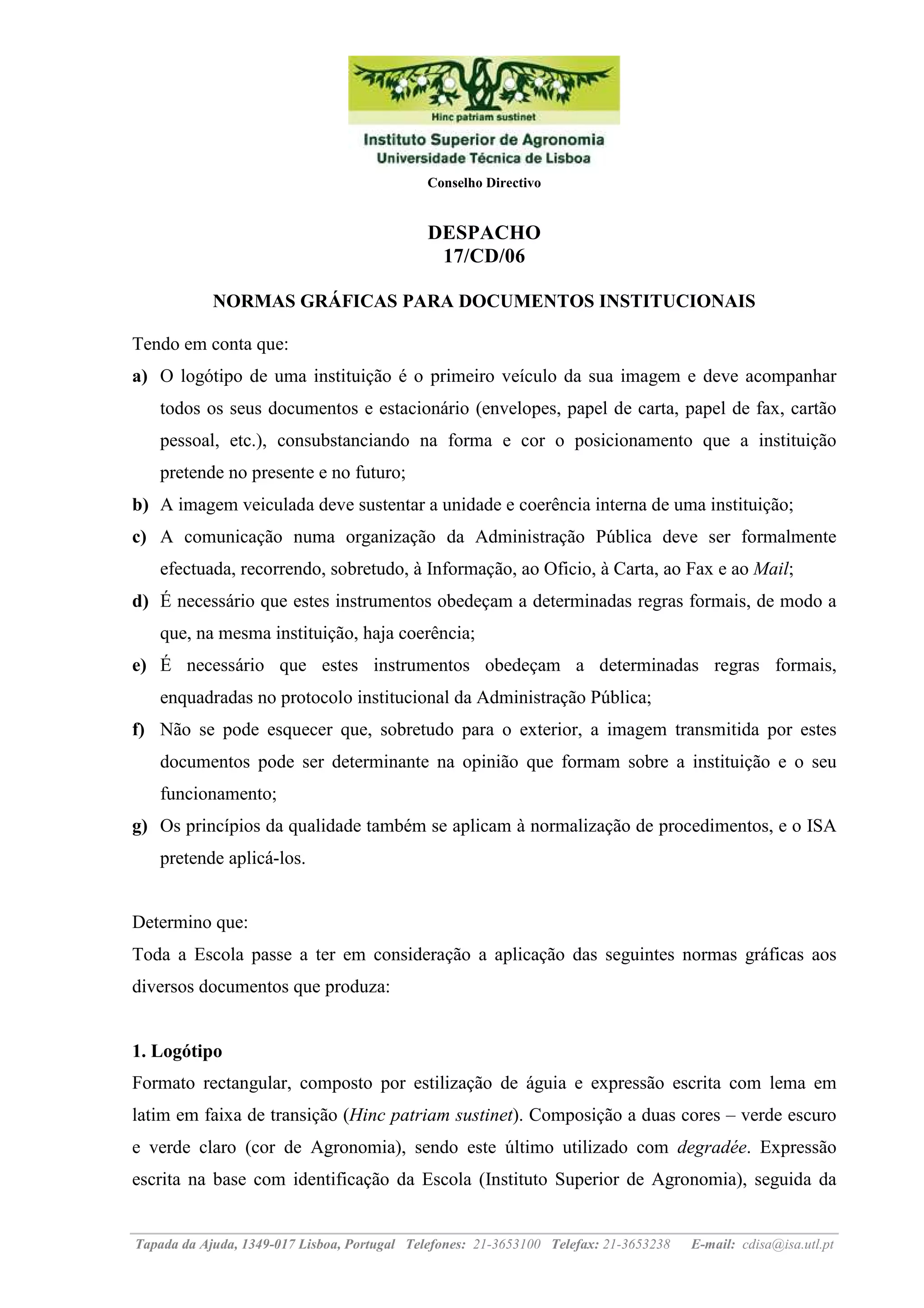 O documento estabelece normas gráficas padronizadas para diversos documentos institucionais produzidos pelo Instituto Superior de Agronomia (ISA) com o objetivo de promover uma imagem coerente e profissional. As normas determinam o formato do logótipo da instituição, regras para envelopes, informações, ofícios, cartas, faxes e e-mails produzidos pelo ISA. Anexos contêm modelos desses documentos.