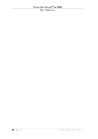 Este manual fornece instruções sobre como utilizar as principais funções do Microsoft Word 2003, incluindo como criar e formatar documentos, inserir tabelas, e imprimir documentos. O manual é dividido em seções cobrindo tópicos como barras de ferramentas, edição de texto, formatação, tabelas e impressão.